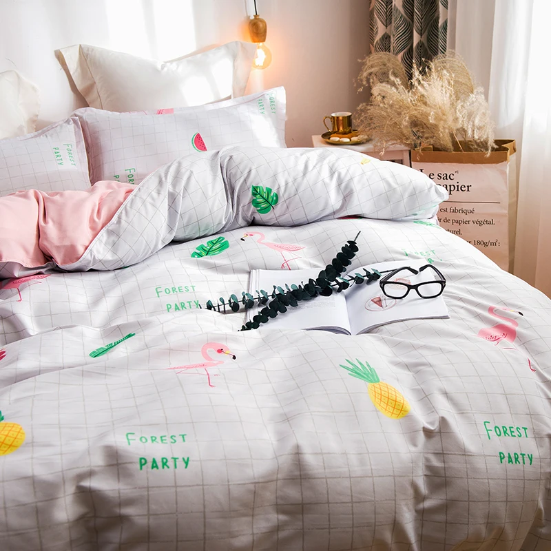 Flamingos pineapple fruit print bedding sets cartoon plaid white duvet cover sets pink flat sheet g
